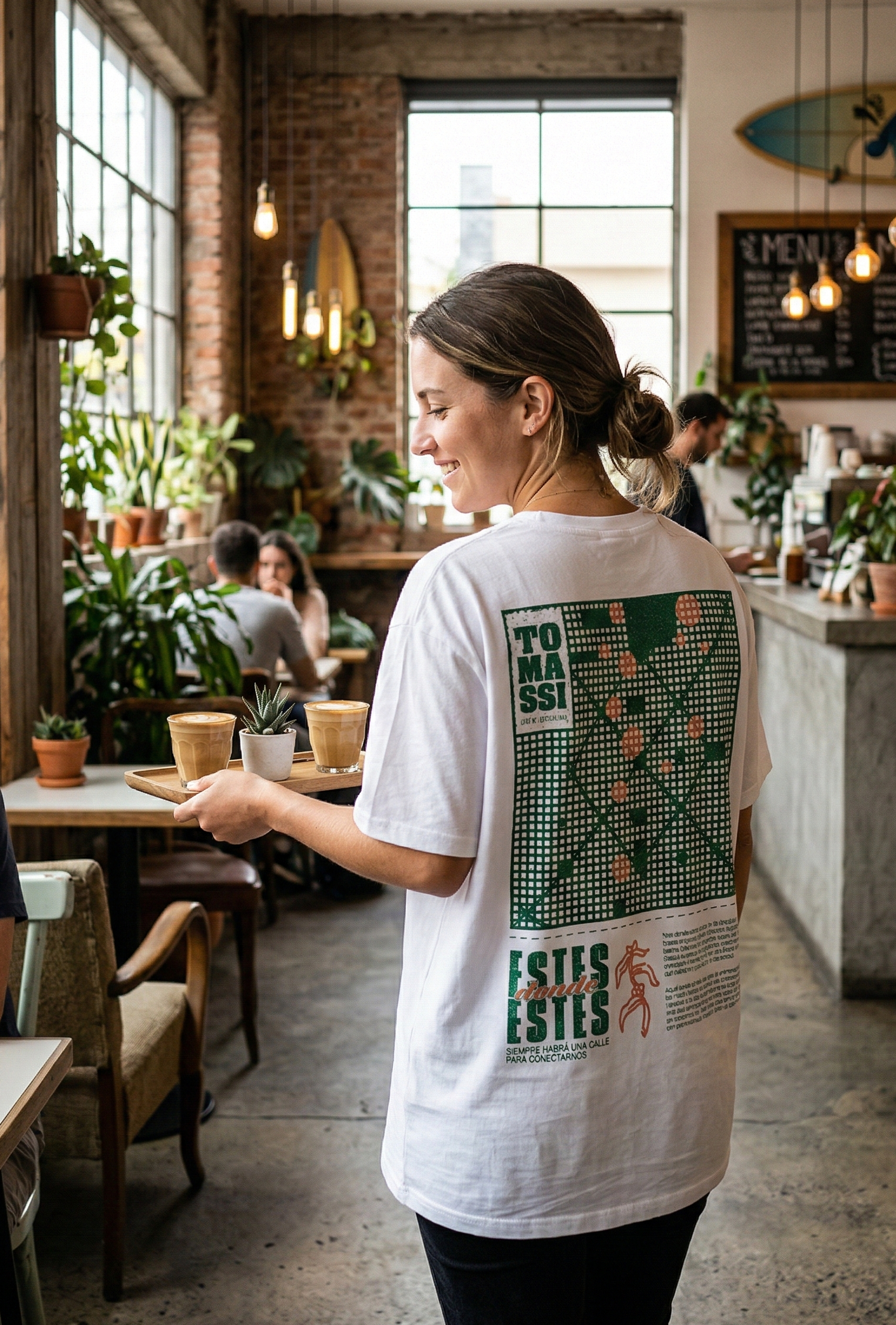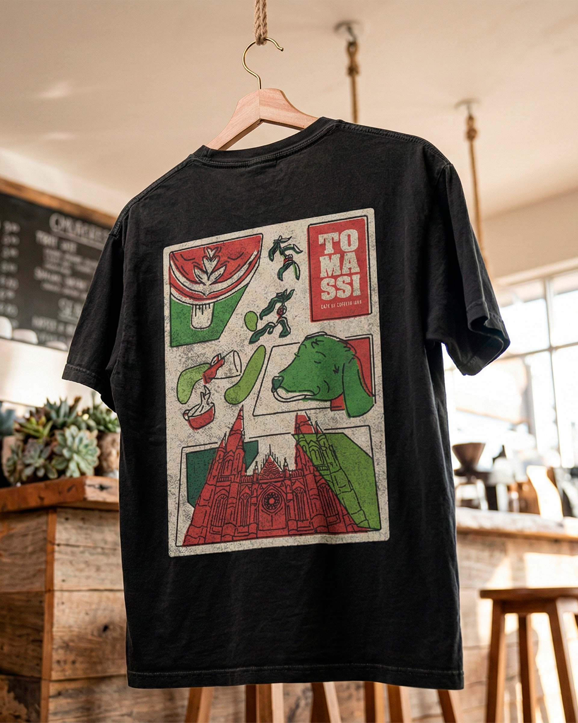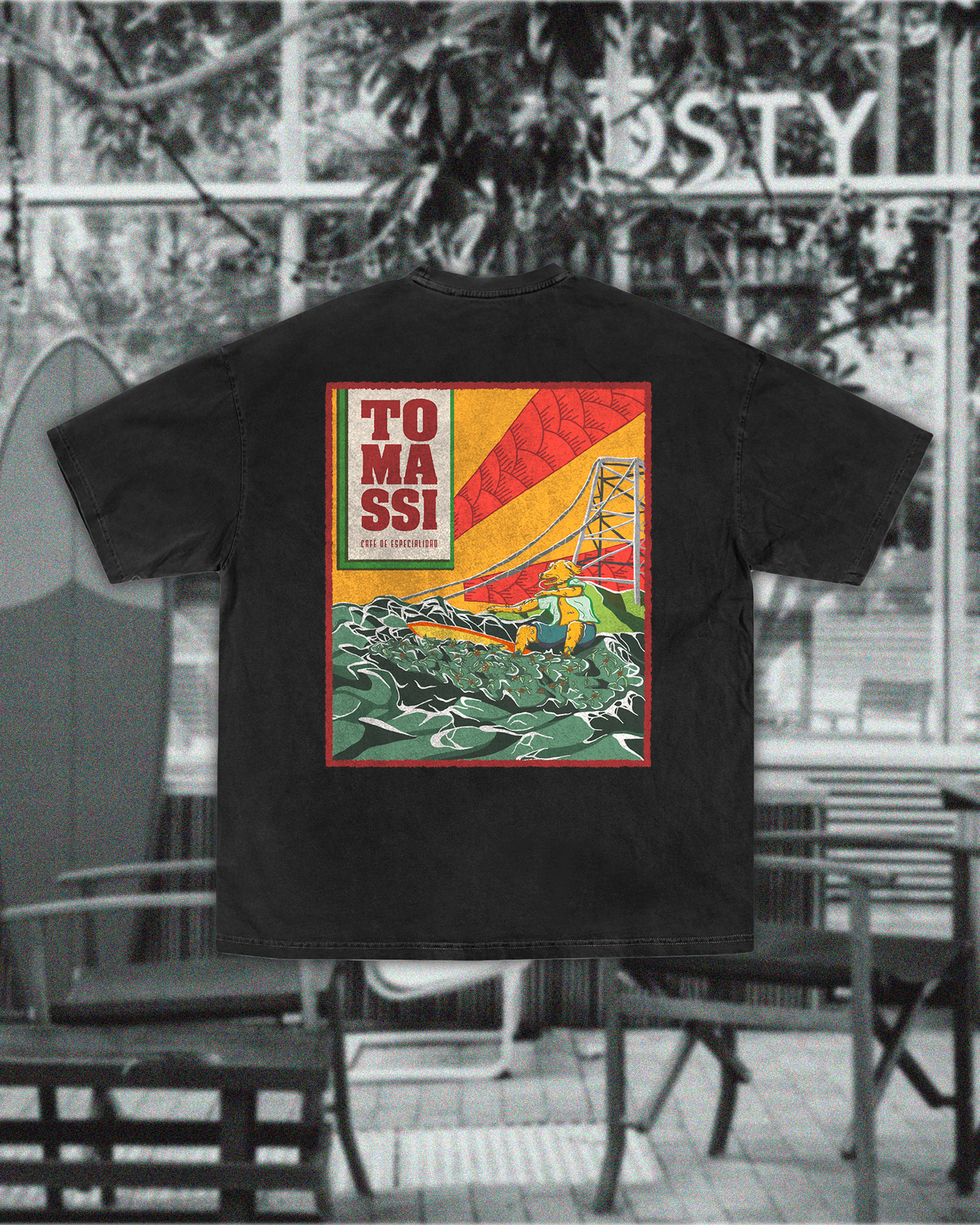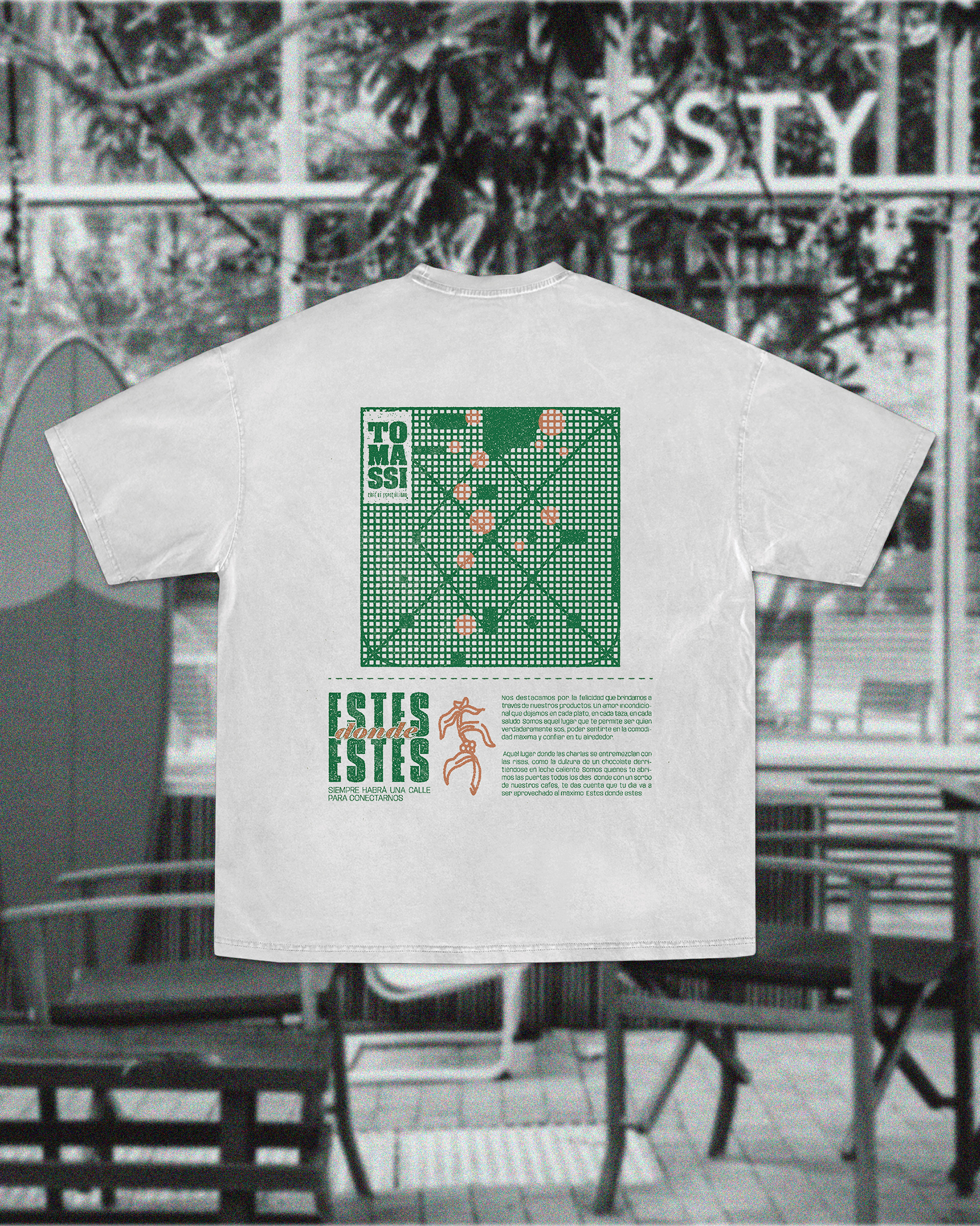 Tomassi Café de Especialidad no es solo un lugar para tomar café; es un punto de encuentro. El objetivo de este proyecto fue trasladar la identidad visual de la marca al "staff merch", creando una serie de remeras oversize que los mozos pudieran usar con comodidad sin perder el estilo urbano y vibrante que caracteriza al local. Buscamos romper con el uniforme tradicional, apostando por prendas que el equipo quiera usar incluso fuera del horario de trabajo.